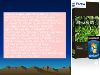 Este documento promociona las características y beneficios del software antivirus Panda Security Pro 2010. Resalta que es fácil de usar e intuitivo, protegiendo contra virus, spyware, rootkits, hackers, fraude en línea y robo de identidad. Incluye varias funciones de seguridad y actualizaciones automáticas diarias.