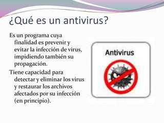 Este documento describe varios programas antivirus populares, incluyendo Norton Antivirus, McAfee VirusScan, F-Secure Antivirus, Trend PC-Cillin, Panda Antivirus Titanium y Platinum, Kaspersky Anti-virus, ETrust EZ Antivirus, Avast! Home Edition y AVG Antivirus. Los antivirus detectan y eliminan virus de computadoras para protegerlas, y la mayoría actualizan automáticamente sus definiciones de virus.