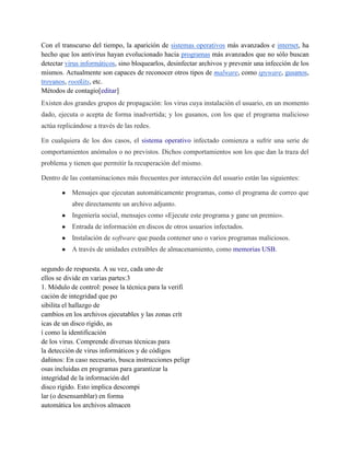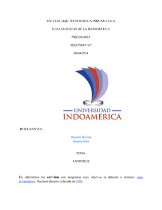 1. El documento habla sobre antivirus, describiendo que son programas que detectan y eliminan virus informáticos.
