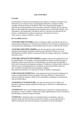 El documento proporciona información sobre los antivirus, clasificándolos en preventores, identificadores, descontaminadores, cortafuegos, antiespías, antispam y detectores. También menciona algunos antivirus gratuitos como Avast, AVG y Microsoft Security Essentials, y antivirus pagados como Norton Antivirus, Norton Security y Kaspersky Anti-Virus.