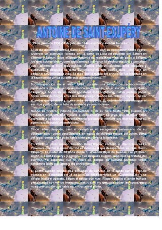 Antoine de Saint-Exupéry fue un escritor y aviador francés que desapareció en 1944 durante una misión de reconocimiento en el sur de Francia. En 1998 se encontró una pulsera con su nombre cerca de donde se descubrieron restos de su avión Lockheed P-38 Lightning en 2003. En 2008, un piloto alemán llamado Horst Rippert confesó haber derribado el avión de Saint-Exupéry en 1944, aunque no se dio cuenta de quién era el piloto hasta después.