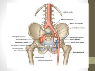 Este documento describe la anatomía de las principales arterias abdominales y de la pelvis, asi como de la extremidad inferior. Resume las arterias que irrigan el hígado, estómago, bazo e intestinos delgado a partir de la aorta abdominal. También describe las arterias iliaca interna y externa, y sus ramas, incluyendo las arterias pélvicas, glúteas y femorales. Finalmente, resume las arterias de la pierna y el pie, como la poplítea, tibial anterior y plantar.