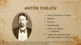 Antón Chejov fue un médico y escritor ruso nacido en 1860. Estudió medicina en la Universidad de Moscú y ejerció como médico mientras también escribía cuentos y obras de teatro. Aunque la medicina era su profesión principal, también encontró el éxito como dramaturgo y escritor. Murió en 1904 a la edad de 44 años debido a la tuberculosis que padecía.
