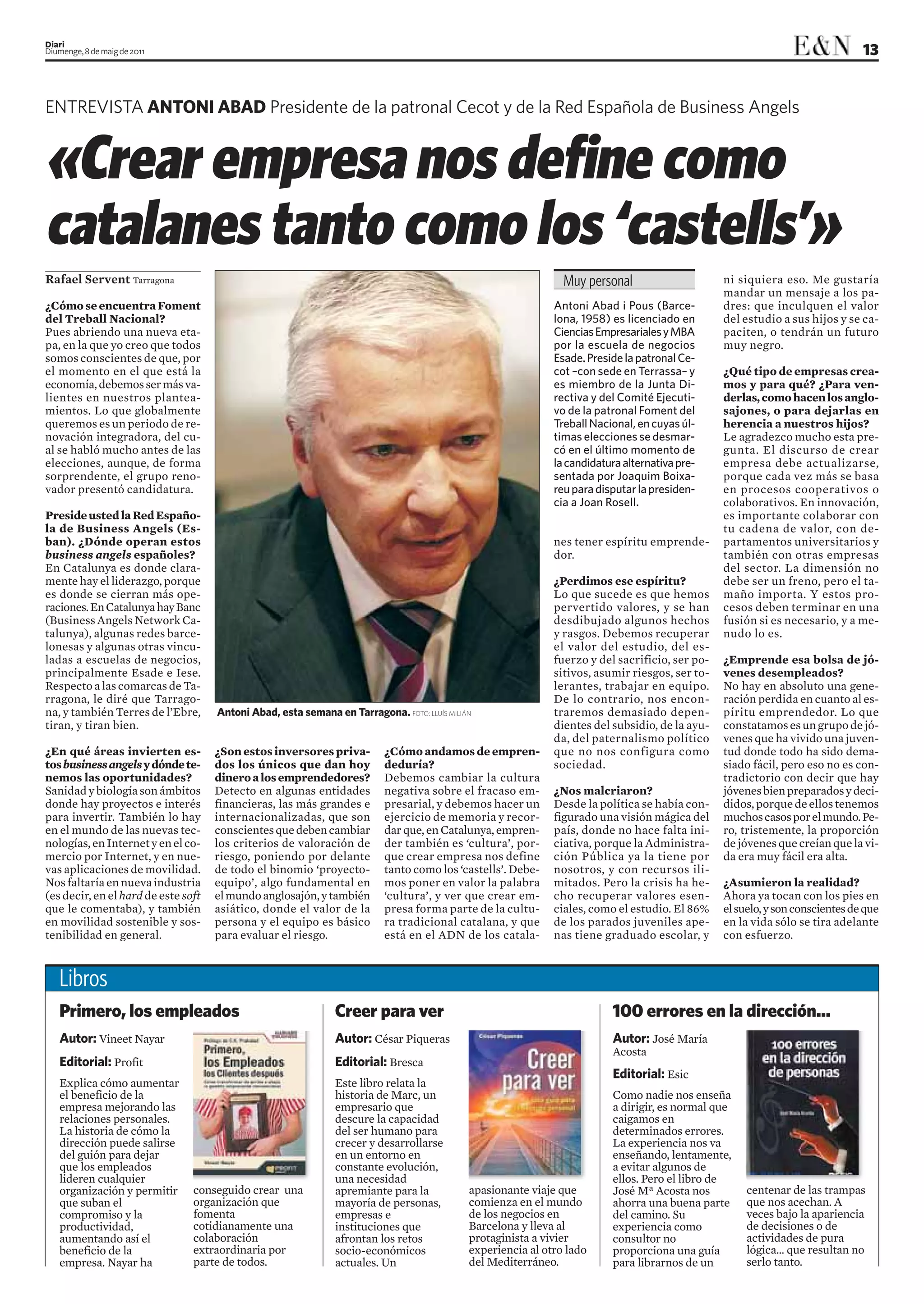El documento presenta una entrevista con Antoni Abad, presidente de la patronal Cecot y de la Red Española de Business Angels. Abad discute la importancia de recuperar valores como el estudio y el esfuerzo para fomentar el espíritu emprendedor en Cataluña. También destaca áreas como la sanidad, la biología y las nuevas tecnologías donde los business angels suelen invertir e insta a cambiar la percepción negativa sobre el fracaso empresarial.