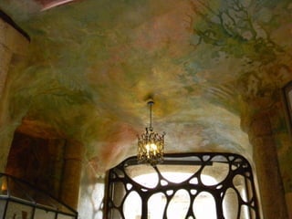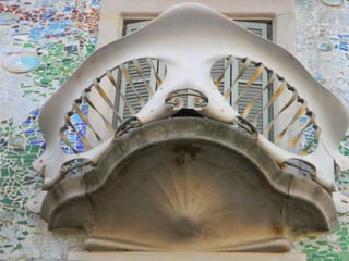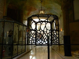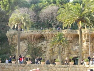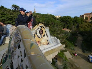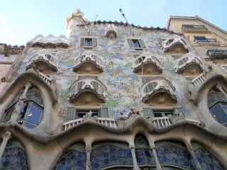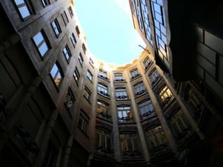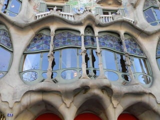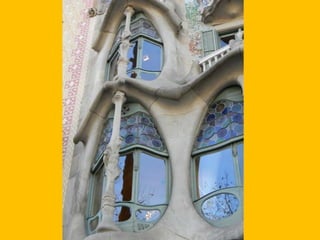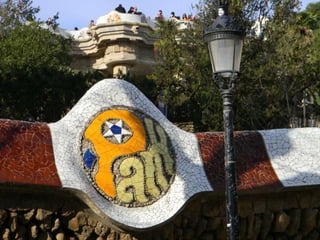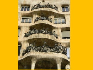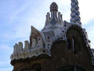 El documento presenta fotografías de cuatro de las obras más conocidas del arquitecto Antoni Gaudí en Barcelona: el Parque Güell construido entre 1900 y 1914, la Casa Batlló de 1904 a 1906, la Casa Milá de 1908 a 1910 y el Templo de la Sagrada Familia en construcción desde 1883 hasta 1926.
