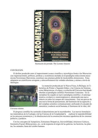 Este documento presenta un libro titulado "Macrometanoia: Un Nuevo Orden, Una Nueva Civilización" escrito por Antonia Nemeth-Baumgartner. El libro argumenta que el paradigma científico newtoniano ya no es válido y ha sido reemplazado por un nuevo paradigma basado en las ciencias de la complejidad. Este nuevo paradigma provee una nueva forma de pensar sobre la naturaleza, conducta humana, vida y el universo. Adicionalmente, el libro sostiene que debido a