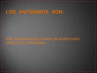 El documento presenta una lista de antónimos, es decir, palabras con significados opuestos. Se menciona la importancia del aprendizaje visual para facilitar la comprensión de estos conceptos. El autor del texto es Silvia Montoya Araujo.
