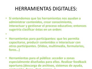 Este documento describe varias herramientas digitales como blogs y YouTube. Explica que los blogs permiten publicar contenido de forma periódica y cronológica y pueden ser creados y mantenidos usando diferentes herramientas. También describe cómo subir y configurar videos en YouTube, el popular sitio web para compartir videos.