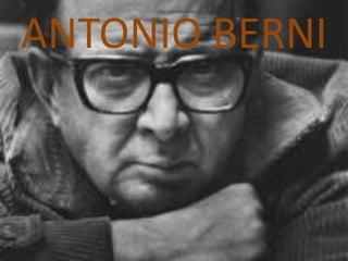 Antonio Berni fue un artista argentino nacido en 1905 en Rosario y fallecido en 1981 en Buenos Aires. Representó en su obra los sectores más bajos y olvidados de la sociedad a través de personajes como Juanito Laguna. En este documento se resume su biografía, se describe la aparición del personaje Juanito Laguna y su influencia en la obra de Berni, así como el surgimiento del personaje Ramona Montiel y un análisis de su obra "Desocupados".