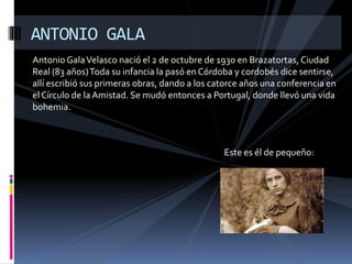 Antonio Gala nació en 1930 en Ciudad Real, España. Pasó su infancia en Córdoba donde escribió sus primeras obras. En 1959 comenzó a enseñar filosofía e historia del arte y tuvo éxito como dramaturgo y periodista. A mediados de la década de 1960 se mudó a Italia donde publicó varios poemas. En 2011 recibió un premio a su trayectoria literaria. Actualmente padece cáncer de vejiga desde 2011 y se somete a tratamientos de quimioterapia y radioterapia para