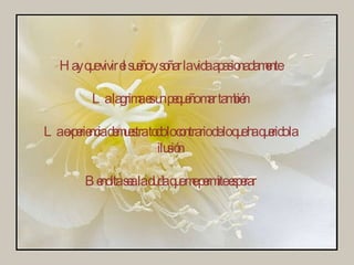 Hay que vivirel sueño y soñar la vida apasionadamente La lagrima es un pequeño mar también La experiencia demuestra todo lo contrario de lo que ha querido la ilusión Bendita sea la duda que me permite esperar