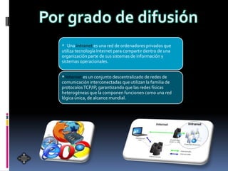 Una intranet es una red privada interna de una organización que utiliza la tecnología y protocolos de Internet para compartir sistemas de información y operativos entre empleados. Internet es una red global descentralizada formada por redes interconectadas que usan TCP/IP para funcionar como una red lógica única de alcance mundial. Las redes se pueden clasificar como comerciales, educativas, para proceso de datos, privadas o de acceso público dependiendo del propósito y acceso.