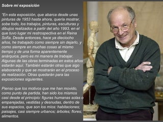 El documento resume la exposición retrospectiva de Antonio López en el Museo Thyssen Bornemisza. La exposición muestra obras desde 1953 hasta la actualidad, abarcando pinturas, esculturas, dibujos y proyectos recientes del artista. Las obras exploran temas como figuras humanas, paisajes urbanos de Madrid, interiores, árboles y bodegones. La exposición ofrece una mirada a la evolución del estilo de López y su dedicación constante a representar el mundo visible.