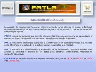 La metodología PACIE permite el uso de las TIC como soporte para el aprendizaje y autoaprendizaje, dando énfasis al esquema pedagógico de la educación presencial. PACIE se basa en la motivación, el acompañamiento, la riqueza de las diferencias individuales, y la calidad sobre la cantidad. Además de informar y enseñar, PACIE busca crear, educar, guiar y compartir conocimiento a través de procesos sociales que fomenten el análisis crítico de la información