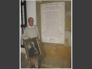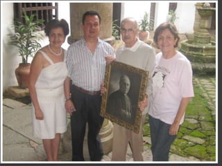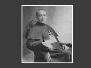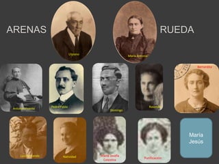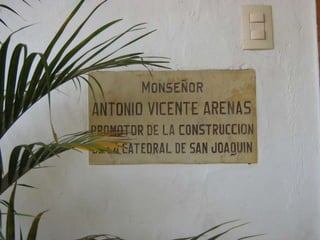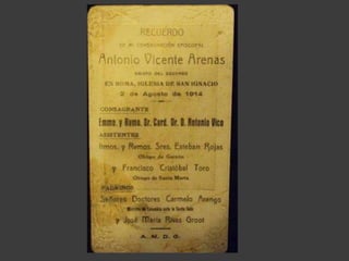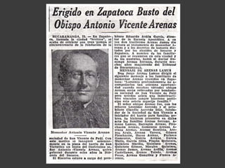 Este documento resume la vida de Monseñor Antonio Vicente Arenas Rueda, incluyendo su fecha de nacimiento en Zapatoca en 1862, su ordenación como obispo en Roma en 1914, y su fallecimiento en 1922 mientras viajaba a Barranca Baja. También incluye un árbol genealógico de su familia y fotos de la catedral donde descansan sus restos.