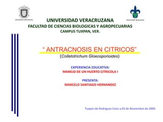 Este documento describe la antracnosis en cítricos causada por el hongo Colletotrichum gloeosporioides. Afecta naranjas, toronjas y limones, reduciendo el rendimiento hasta en un 70%. Los síntomas incluyen necrosis en pétalos y frutos amarillentos que caen prematuramente. Su control requiere aplicación de fungicidas durante la floración. Experimentos mostraron que algunos antagonistas microbianos como Bacillus subtilis y Trichoderma spp. pueden reducir la enfermedad, aunque su