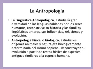 Este documento presenta una introducción a la antropología como disciplina académica. Explica que la antropología estudia al ser humano de manera holística, analizando su origen, desarrollo como especie social y cambios conductuales a través del tiempo. También resume brevemente la evolución histórica de la antropología desde sus inicios en el siglo XVIII, el surgimiento del evolucionismo cultural en el siglo XIX y las diferentes teorías evolucionistas posteriores. Por último, introduce conceptos clave como cultura y las caracter