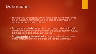 La antropología estudia al ser humano de manera holística, considerando factores biológicos, sociales, culturales, lingüísticos y del comportamiento a través del tiempo. Se enfoca en comparar sistemáticamente datos entre poblaciones y épocas diferentes. Incluye el estudio de la cultura, la arqueología, la biología y el lenguaje humanos. Usa métodos como la etnografía, la arqueología, el trabajo de campo y el análisis holístico para comprender los seres humanos y sus socied