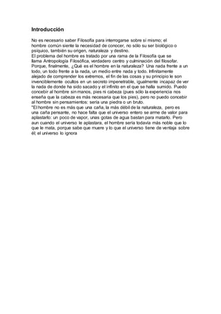 El documento trata sobre la antropología filosófica. Explica que la antropología filosófica estudia la naturaleza del ser humano desde una perspectiva filosófica, interrogándose sobre el origen, naturaleza y destino del hombre. Luego presenta breves definiciones de la antropología filosófica según filósofos como Kant, Heidegger y Horkheimer. Finalmente, discute algunas características y problemas centrales de la antropología filosófica, como si el hombre tiene una esencia fija o