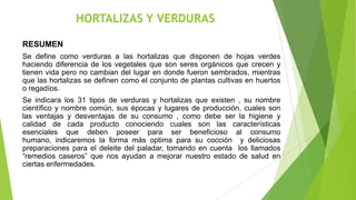El documento presenta información sobre un seminario sobre hortalizas y verduras dictado a estudiantes de nutrición. Se definen verduras y hortalizas, y se indica que se presentarán 31 tipos, con su nombre científico y común, época y lugar de producción, ventajas y desventajas de su consumo, y formas de cocción. Los objetivos incluyen desarrollar habilidades para elaborar dietas balanceadas con estas plantas.