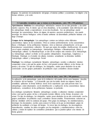El documento resume los conceptos fundamentales de la antropología cultural. Explica que la antropología estudia a los seres humanos y sus relaciones desde una perspectiva holística. También describe los diferentes campos de la antropología como la antropología biológica, la arqueología, la lingüística y la etnología. Finalmente, señala que la etnología intenta comprender las diferencias en las formas de pensar y actuar entre los grupos humanos del pasado y presente.