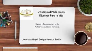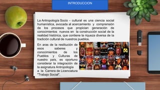 Este documento presenta una introducción a los fundamentos de la antropología socio-cultural. Explica que esta disciplina estudia los procesos de generación de conocimiento y construcción social de la realidad histórica de los pueblos. Detalla algunas teorías antropológicas clásicas y métodos de investigación cualitativa y cuantitativa. También discute la importancia de considerar las antropologías del Sur y las características particulares de estas tradiciones de conocimiento antropológico.