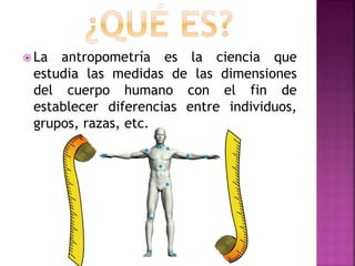 Este documento describe los principios y métodos de la antropometría, que estudia las medidas del cuerpo humano. Explica que se usan para establecer diferencias entre individuos y diseñar equipos y espacios de trabajo seguros y adaptados a las dimensiones humanas. También presenta tablas con datos antropométricos como estatura, longitud de brazos y piernas de poblaciones latinoamericanas, incluyendo promedios, desviaciones estándar y percentiles. Recomienda diseñar para la persona más grande y con capacidad de ajuste