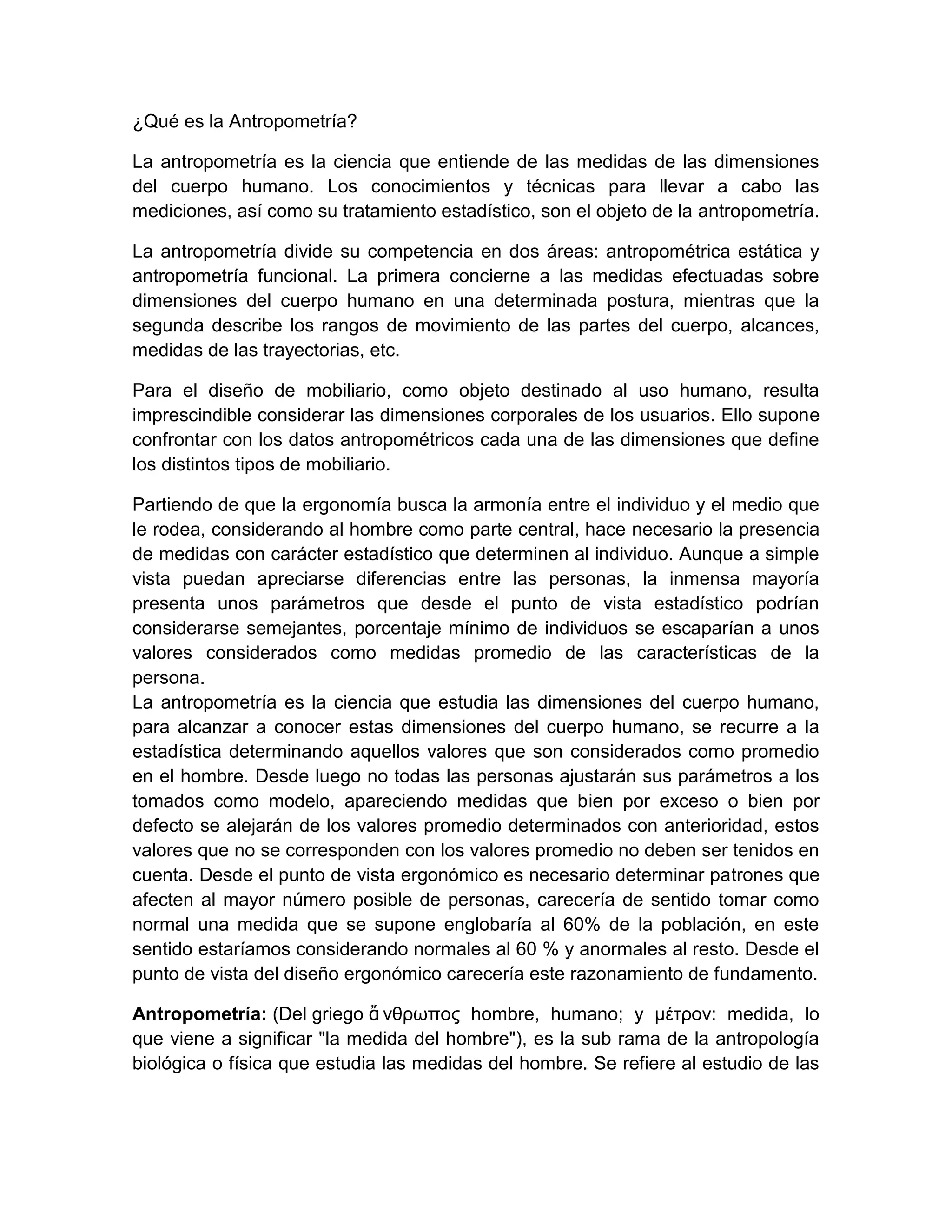 La antropometría es la ciencia que estudia las medidas del cuerpo humano con el fin de establecer parámetros promedio y considerar las diferencias entre individuos. Estudia tanto las dimensiones estructurales del cuerpo en posición estática como las funcionales y dinámicas involucradas en el movimiento. Los datos antropométricos son fundamentales para el diseño ergonómico de muebles y espacios arquitectónicos que deben ajustarse a las necesidades del cuerpo humano.
