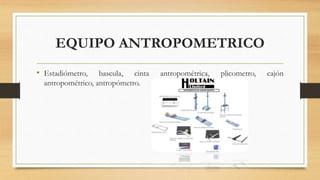 La antropometría es la ciencia que estudia las medidas del cuerpo humano y ha existido desde el siglo XVIII. Incluye equipo como estadiómetros y cintas para medir dimensiones estructurales como estatura, peso y pliegues cutáneos, así como dimensiones funcionales durante el movimiento. Las medidas proveen información sobre salud y diseño ergonómico.