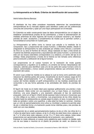 Este documento describe la importancia de la antropometría en el diseño de moda. Explica que los diseñadores deben considerar las características antropométricas de su mercado objetivo para identificar las preferencias comunes del consumidor. Describe las proporciones del cuerpo humano y cómo han evolucionado a través de la historia. También explica conceptos como siluetas, somatotipos y medidas antropométricas, y cómo esta información puede usarse para diseñar ropa que se ajuste mejor a las necesidades del consumidor.