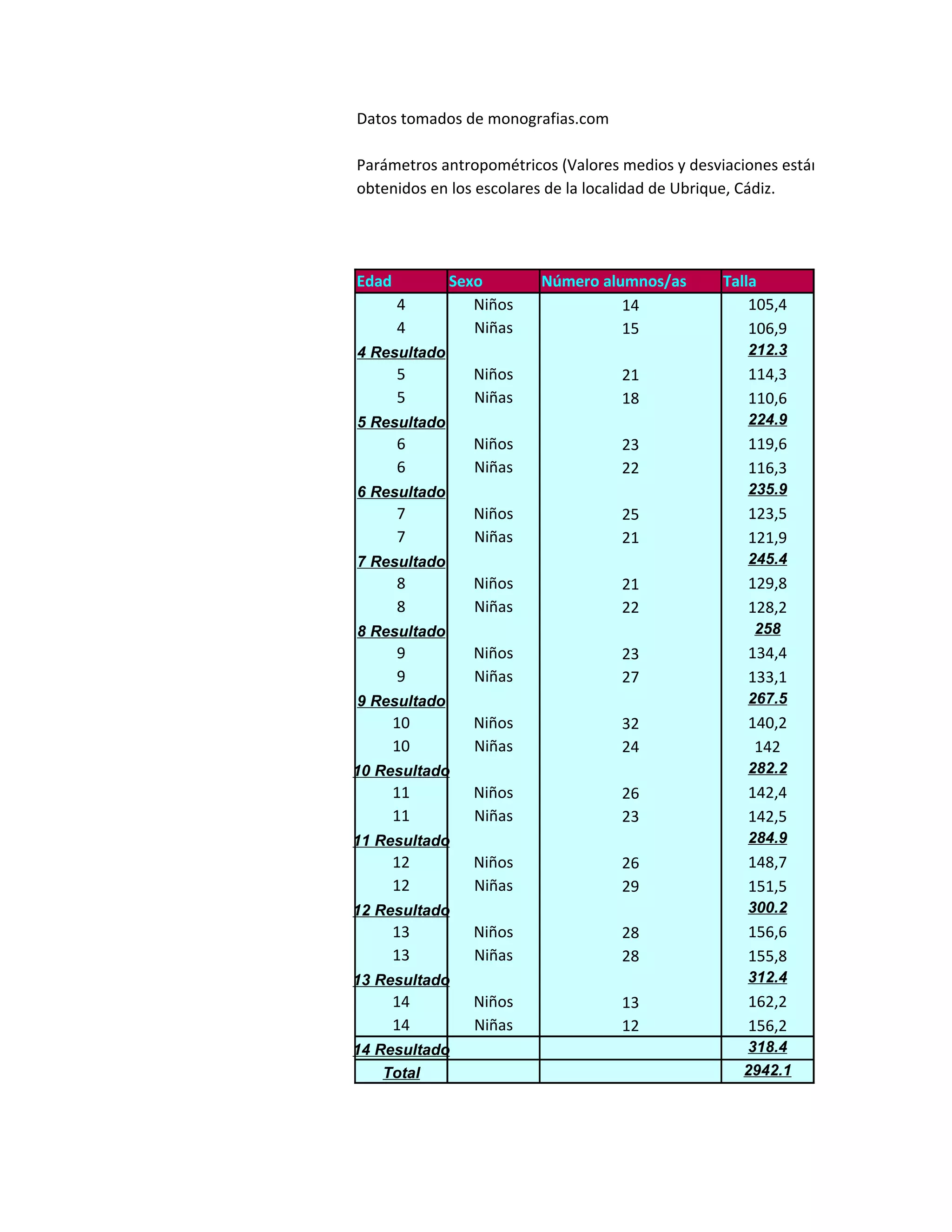 El documento presenta los parámetros antropométricos, incluyendo la talla, peso, pliegue cutáneo y perímetro braquial, de estudiantes entre 4 y 14 años en Ubrique, Cádiz. Se muestran los valores promedio de cada parámetro por edad y sexo, así como el número total de estudiantes evaluados. Los resultados indican que la talla y peso promedio aumentan con la edad de forma consistente entre niños y niñas.