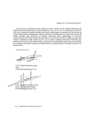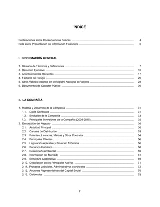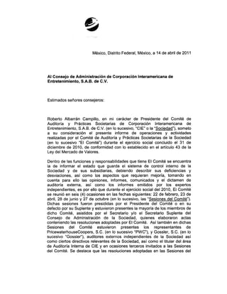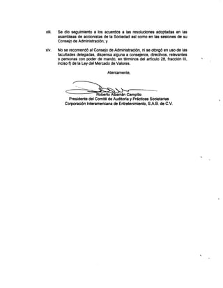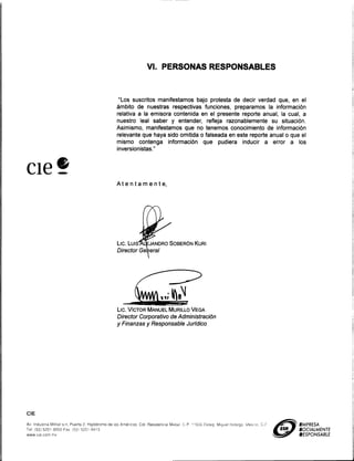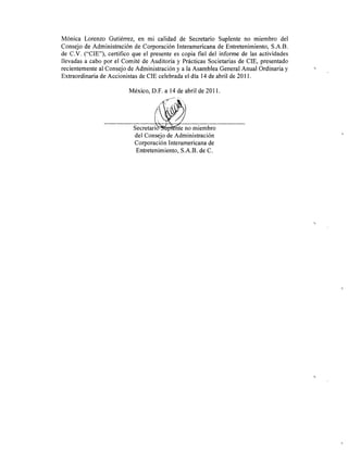 Este documento presenta información general sobre Corporación Interamericana de Entretenimiento S.A.B. de C.V. (CIE), incluyendo su capital social, acciones en circulación en la Bolsa Mexicana de Valores, y registro de valores. Además, contiene un índice de la información financiera y no financiera incluida en el reporte anual.