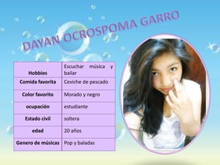 Este documento contiene perfiles de 20 personas que incluyen sus pasatiempos, comida favorita, color favorito, ocupación, estado civil, edad y género musical preferido. La mayoría son estudiantes solteros entre 18 y 32 años, y les gusta escuchar música, bailar, jugar voleibol y comer ceviche, milanesa y picante de cuy.