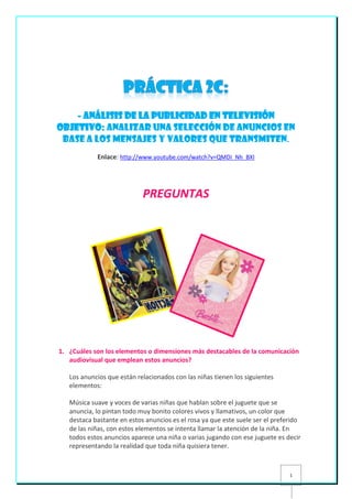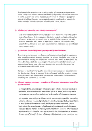 Este documento analiza los anuncios de televisión dirigidos a niños y niñas. Se destacan elementos como la música suave, colores vivos y la representación de niños jugando con los productos. Los anuncios transmiten estereotipos de género al promover muñecas para niñas y juguetes de acción para niños. También se considera necesario enseñar el análisis publicitario en las escuelas para que los estudiantes aprendan a identificar los mensajes implícitos y el poder de influencia de