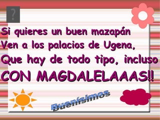 El documento promociona los mazapanes hechos en los palacios de Ugena, los cuales incluyen variedades con magdalenas. Se proporciona una receta fácil de mazapán que incluye azúcar glasé, almendras molidas, huevos y opcionalmente limón o canela. Además, se ofrece la oportunidad de obtener camisetas de un equipo local al comprar los mazapanes por teléfono.