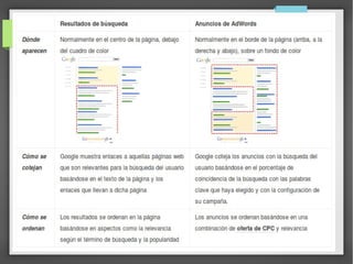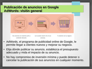 Este documento proporciona una introducción a los anuncios de Google AdWords. Explica que AdWords permite a las empresas llegar a nuevos clientes y mejorar el negocio mediante anuncios en línea sin un compromiso de inversión mínima. También describe las ventajas de AdWords como controlar el presupuesto, ver qué anuncios funcionan mejor y segmentar los anuncios por ubicación geográfica y idioma para mejorar los resultados.