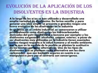 Los disolventes se utilizan ampliamente a pequeña y gran escala en procesos químicos e industriales. Inicialmente, la industria utilizó principalmente hidrocarburos derivados del petróleo y disolventes oxigenados, aunque presentan riesgos para la salud y el medio ambiente. Más recientemente se han planteado alternativas como los clorocarbonados, que son más seguros para su manipulación pero cancerígenos.