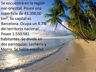 Este documento proporciona información sobre lugares turísticos, sitios de hospedaje y restaurantes en la región de Anzoátegui, Venezuela. Describe atracciones como el Ateneo de Barcelona, la Iglesia de Nuestra Señora de la Concepción, y playas como Playa Los Canales. También menciona opciones de hospedaje como Cabañas Pitisay y Posada La Morenita, así como restaurantes recomendados como Babilonia y Tasca de Manolo.