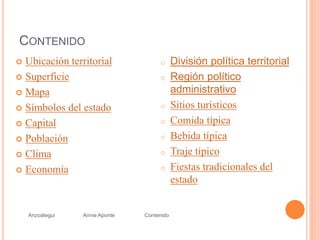 El documento resume información sobre el estado de Anzoátegui en Venezuela. Ubicado en la región nororiental, limita con otros estados y tiene una superficie de 43,300 km2. Su capital es Barcelona y sus principales industrias son el petróleo, la ganadería y la pesca. Algunos de sus símbolos y tradiciones incluyen el alcaraván, el majarete como plato típico y fiestas como el Velorio de Cruz de Mayo.