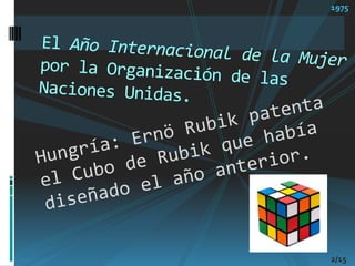 El documento resume los principales eventos de 1975, incluyendo el Año Internacional de la Mujer declarado por la ONU, la patente del Cubo de Rubik y el fin de la dictadura franquista en España tras la muerte de Francisco Franco. Otros acontecimientos notables fueron la independencia de Mozambique, Cabo Verde y otros países de Portugal, así como el estreno de las populares películas Tiburón y Alguien voló sobre el nido del cuco.