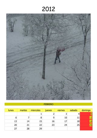 El documento presenta un calendario del año 2012, mostrando los días de la semana para cada mes. En enero hubo 31 días, febrero tuvo 29 días, y el resto de los meses siguieron el patrón habitual de días para cada mes.