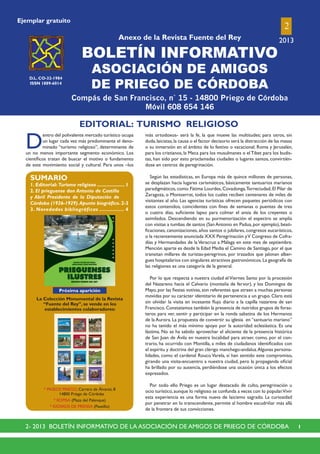El boletín informativo de la Asociación de Amigos de Priego de Córdoba destaca el crecimiento del turismo religioso, que se ha convertido en un importante segmento económico que atrae a millones de personas a lugares sagrados europeos. Además, se presenta un apunte biográfico sobre Don Antonio de Castilla y Abril, quien fue presidente de la Diputación de Córdoba entre 1926 y 1929, y su contribución a la política local y la administración provincial. La publicación también menciona la falta de apoyo para convertir la iglesia de San Francisco en un santuario mariano, lo cual ha limitado su potencial turístico.