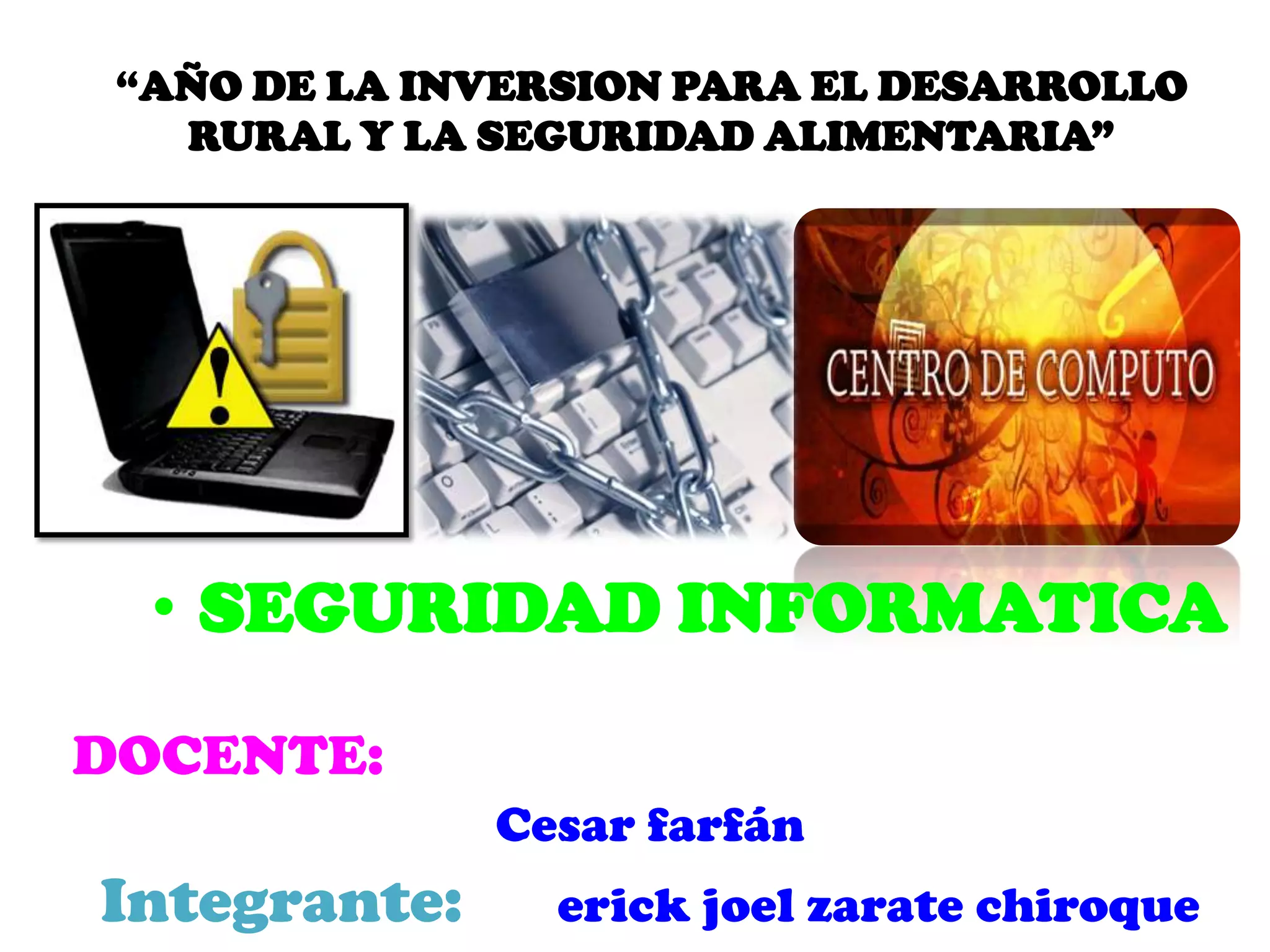 El documento habla sobre la seguridad informática y sus principios. Explica que la seguridad informática se enfoca en proteger la infraestructura computacional y la información de una organización. También describe los tres principios de seguridad: confidencialidad, integridad y disponibilidad. Además, identifica varias amenazas como usuarios maliciosos, intrusos y desastres naturales que pueden poner en riesgo la seguridad de un sistema.