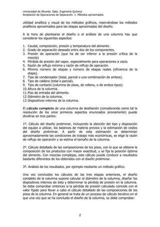 El documento presenta una introducción a los métodos aproximados para calcular operaciones de separación de mezclas multicomponentes. Explica que tradicionalmente se diferencia entre mezclas binarias y multicomponentes debido a que los métodos gráficos no son aplicables a estas últimas. Describe los pasos generales para el cálculo del diseño preliminar de una columna de destilación, incluyendo balances de materia preliminares, recopilación de datos de equilibrio, selección de la configuración óptima y estimación de costes. Final