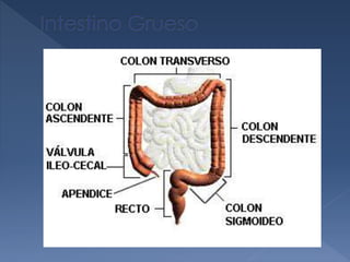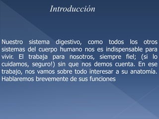 El documento describe el sistema digestivo humano. Explica que está compuesto por una serie de órganos que transforman los alimentos mediante procesos químicos y mecánicos en sustancias simples que pueden ser absorbidas por los tejidos. Describe las principales estructuras del sistema digestivo como la boca, esófago, estómago, intestino delgado, intestino grueso y sus funciones.