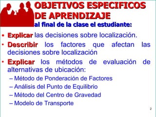 El documento presenta información sobre la localización de proyectos de inversión. Explica que la localización afecta los costos de un proyecto y que el objetivo es maximizar las ganancias a través de una ubicación óptima. Luego, describe varios métodos para evaluar alternativas de ubicación, como el método de ponderación de factores, análisis de punto de equilibrio y modelo de transporte. Finalmente, detalla factores como recursos, mano de obra y mercados que influyen en la decisión de localización.