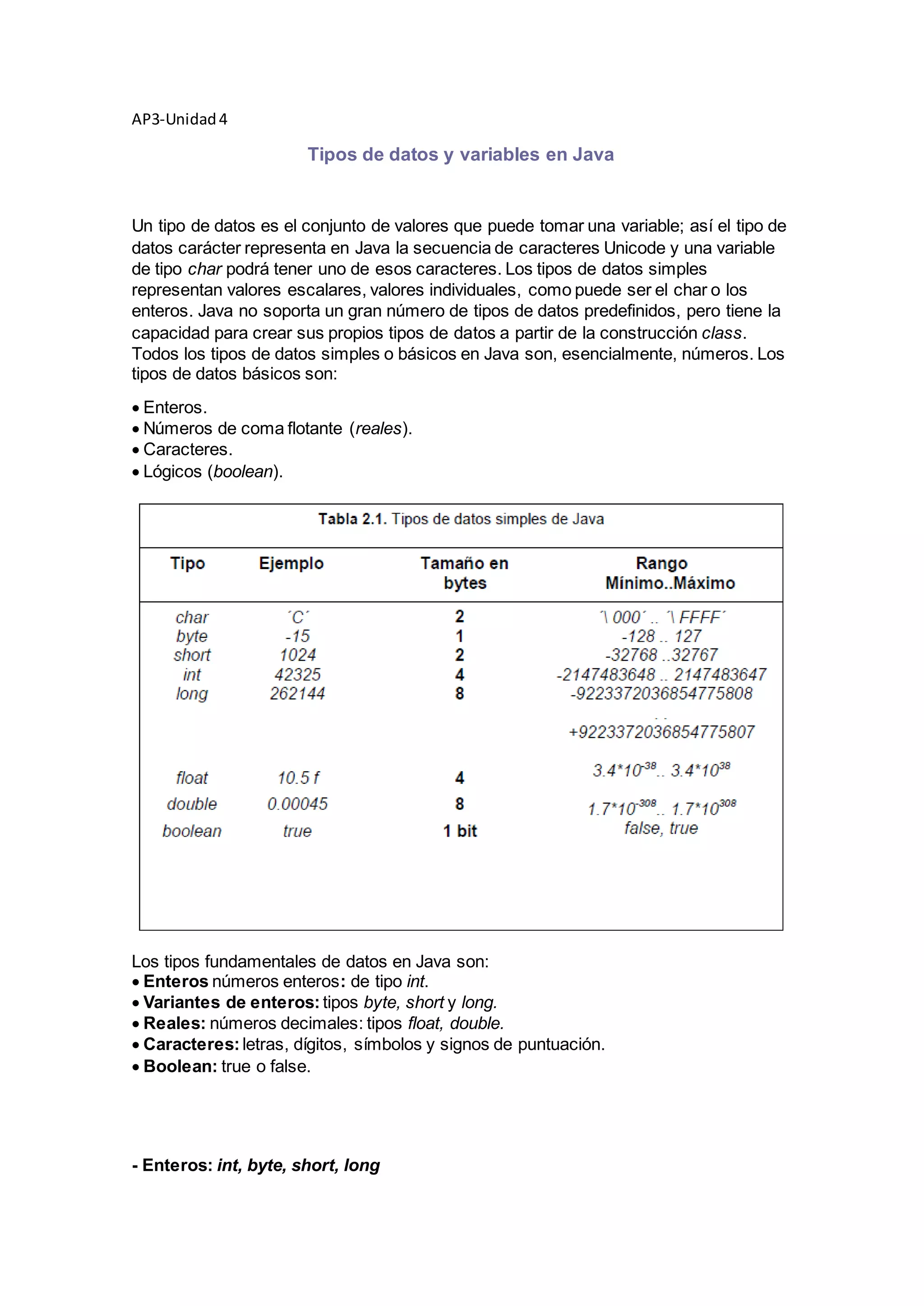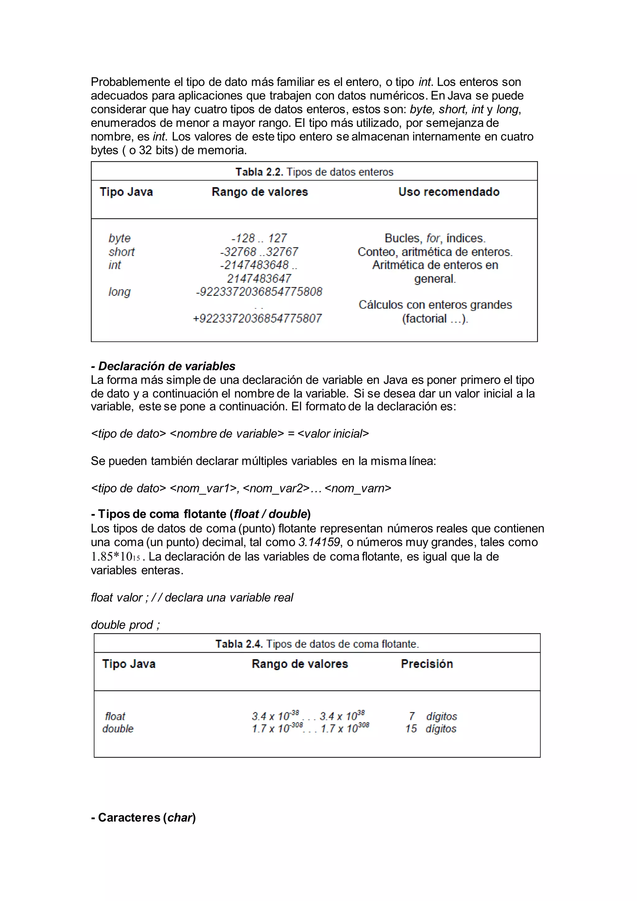 Este documento describe los diferentes tipos de datos en Java, incluyendo enteros, números de punto flotante, caracteres, lógicos y void. Explica que los tipos de datos representan valores como números y caracteres que pueden ser almacenados en variables. También detalla los cuatro tipos principales de enteros y cómo declarar y asignar valores a variables de diferentes tipos.
