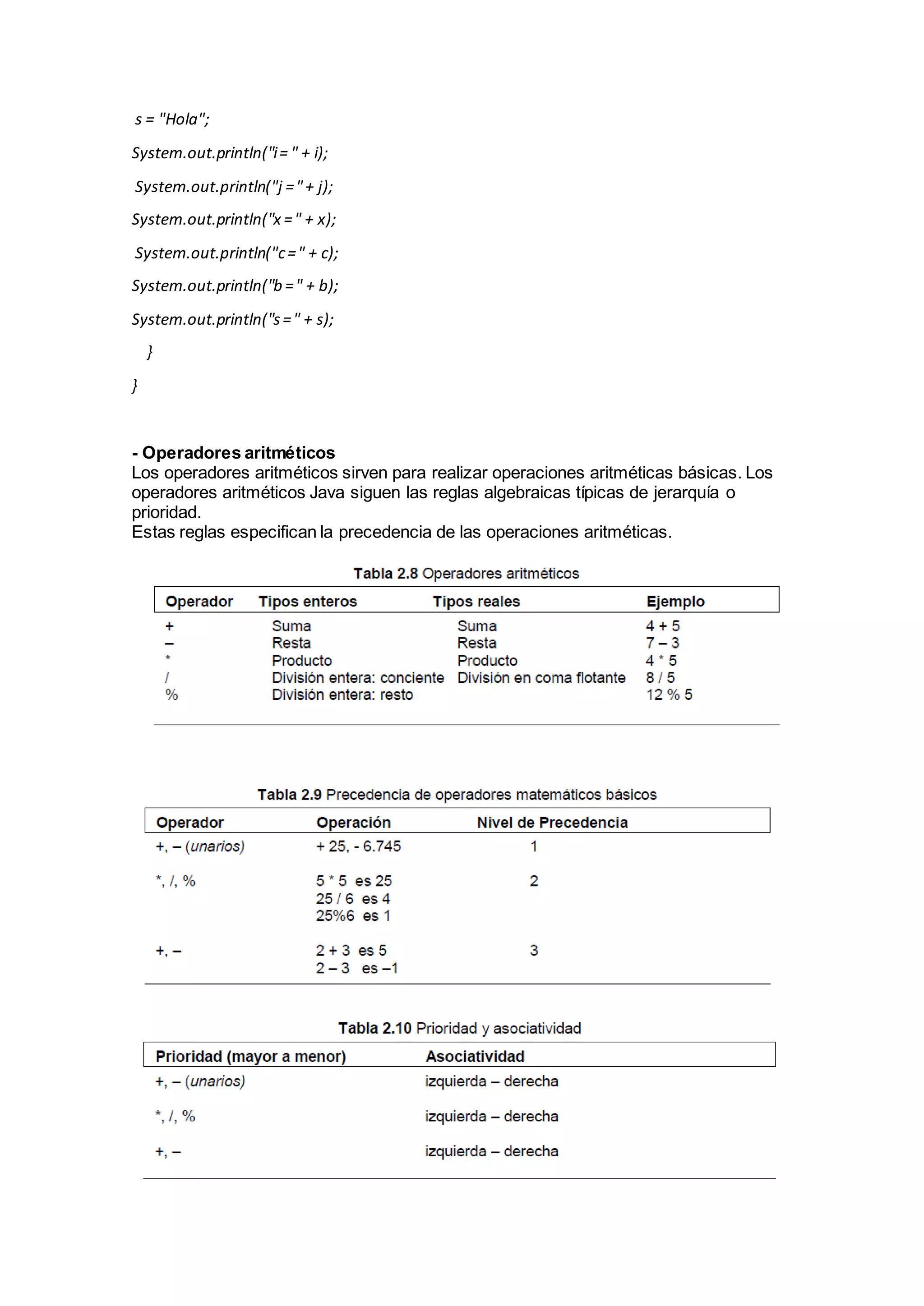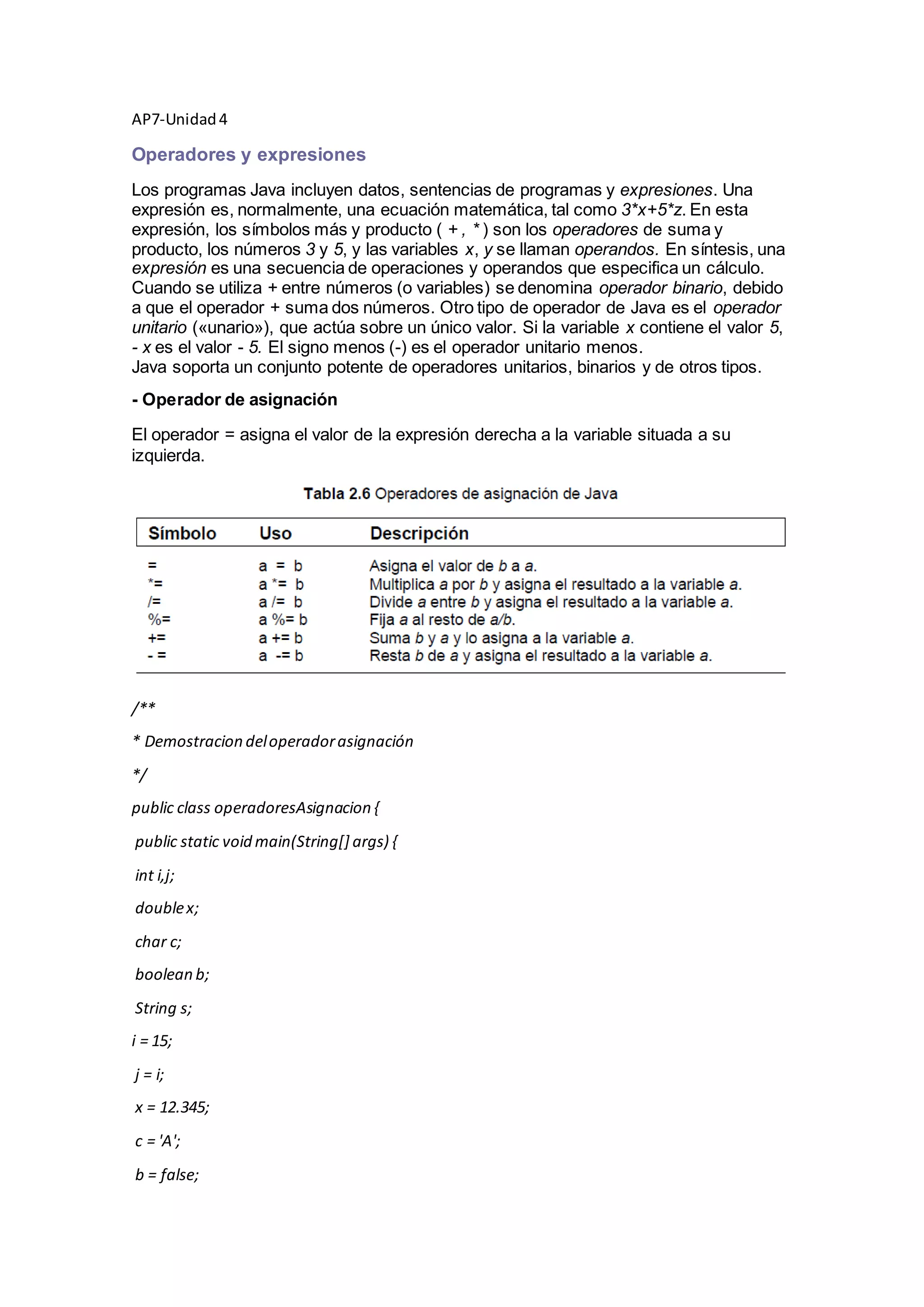 El documento explica los diferentes tipos de operadores en Java, incluyendo operadores aritméticos, relacionales, de asignación, incrementación/decrementación y el uso de paréntesis. Describe cómo los operadores permiten realizar cálculos y comparaciones en expresiones Java.