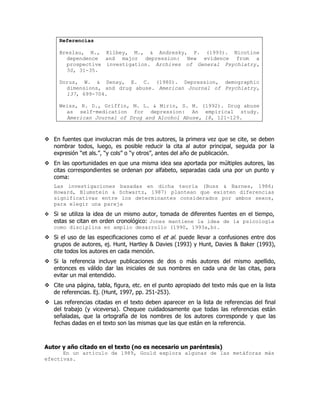 Este documento proporciona una guía sobre el formato APA de citas y referencias. Explica que el estilo APA requiere citas en texto con paréntesis en lugar de notas al pie, y una sección de referencias al final. También cubre detalles de formato como el uso de doble espacio, estilos de títulos y sangrado.