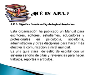 Este documento explica qué es el estilo APA para citas y referencias bibliográficas. El APA es una guía establecida por la Asociación Americana de Psicología para estructurar trabajos escritos de manera clara y efectiva. El documento detalla los formatos APA para títulos, citas textuales, contextuales y de otras fuentes, así como las reglas para elaborar bibliografías de libros, revistas, diccionarios y fuentes electrónicas.